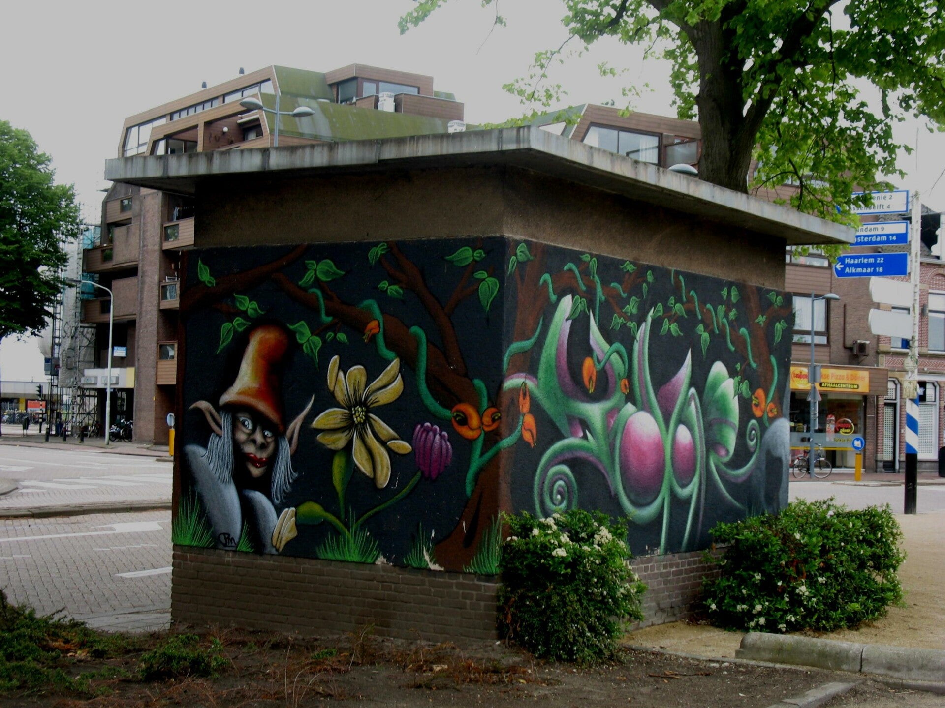 Zaanweg - Muurschildering "Gnoom", kunstenaar Peter Meijn, op elektriciteitshuisje Continuon aan de Zaanweg te Wormerveer. Een "Gnoom" = een aardgeest, berggeest, kabouter, kobold, fabelachtigwezen. In de periode 30 juni t/m 3 juli 2005 hebben De Zaanse Cultuurmarkt, Fluxus, jeugdensemble Rajakymoes en Graffiti Art Projects een interessante en spraakmakend project gerealiseerd. Het bovenstaande samenwerkingsverband is gekomen tot een nieuwe moderne versie van de "schilderijen van een tentoonstelling" van Modest Moussorgsky.