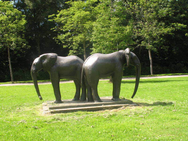 Park Noorderveld Noordsterweg: Jean Baptist de Winter, 1981, brons, ca. 1.5 meter. Als je er niet op bedacht bent en het is een beetje schemerig dan sta je raar te kijken als er in het park opeens de silhouetten van twee baby -olifantjes opduiken. Olifanten in een Nederlands park. Dat werkt vervreemdend. Stilstaand, kont aan kont, in gedachten verzonken. Even groot maar toch verschillend. En van brons, zwartgroen gepatineerd. De kunstenaar ziet olifanten als symbool van uitstervende diersoorten. Erg vrolijk zijn zijn beesten ook niet. Ze staan en wachten op wat komen gaat. Voor een bronzen beeld moet je eerst met de hand van zachte klei of boetseerwas een 'model' maken. Daarvan kun je dan een afgietsel in brons laten maken. Brons roest niet en is erg taai. Bronzen beelden kunnen goed tegen regen, wind, zon, uitlaatgassen, vuil en stof.