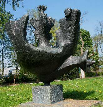 Het kunstwerk is moelijk te bekijken, er staat een groot hek voor.