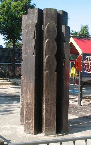 School Over de Brug, Boerenpad 22. Krekel van Spronsen-Duller (1948), 1990, hout en metaal, ca. 4 meter Het houten beeld dat je hier ziet trekt zich van niemand iets aan. Zes gebeeldhouwde palen staan dicht tegen elkaar aan in een rondje en sluiten zich af van de buitenwereld. Een onderonsje. Zes balken waaruit eenvoudige vormen zijn gesneden. Ovalen, driehoeken en kleine hoekjes. Ze vormen drie paren. Van dezelfde familie, maar toch verschillend. Net als mensen, net als kinderen.