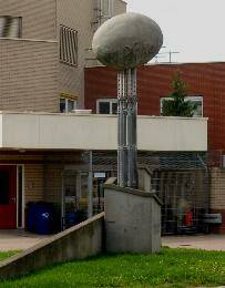 Verpleeg-/ verzorgingshuis Guisveld bij de achterkant aan de George Gerschwinstraat: Ellen Faber (1961) 1999, structuurbeton en steigerpijp, ca. 5,5 meter, (foto: Ellen Faber). Meestal koopt iemand een beeld of laat het maken. Maar dit is gewonnen via een televisieshow! Het materiaal was door bouwbedrijven beschikbaar gesteld. Voorwaarde was dat de kunstenaar het materiaal anders zou gebruiken dan in de bouw. Dat is wel gelukt. Een soort trappiramide is het geworden met een betonnen ei dat door metalen stempels gedragen wordt. Een herkenningspunt. Het beton is ter plekke gestort.