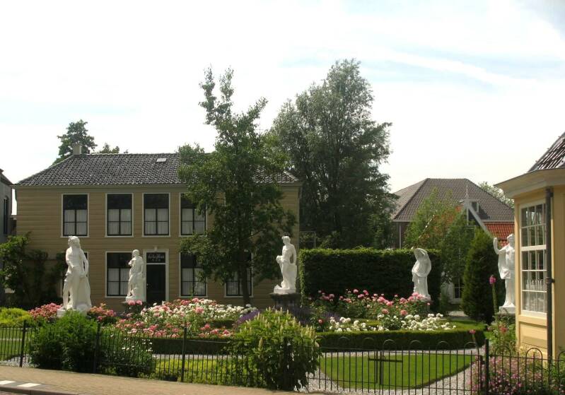 Lagedijk 39 voor het Weefhuis : De vijf zandstenen beelden op hardstenen voetstukken in de Beeldentuin stellen voor Bacchus, Morgen, Middag, Avond en Nacht. Door de Zaandijkse koopman Claas Adriaansz Honig werden de beelden op een veiling in Zaandam zijn gekocht. De beelden stellen ook Bacchus, Ochtend, Avond, Middag en Nacht voor. Ze komen uit de Tuin van Vermaak bij het Huis van Polanen in Halfweg, het eerste huis daar. En verhuisden in oktober 1804 naar de tuin van Grietje Jans Haremaker. In 1804 liet Honig de beelden naar Zaandijk overbrengen. De Beeldentuin is altijd een 'Zaans pronkjuweel' gebleven, zowel in de lente (links boven), zomer (rechts boven), winter (rechts onder) als herfst (links onder). Ze werden vervaardigd in een Italiaanse Steenhouwerij.