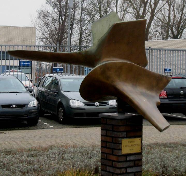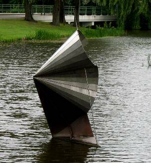 Valentijn van der Heide (1952), 1991, roestvrij staal, Valentijn van der Heide werkt met staal en maakt zijn beelden meestal zelf. Altijd abstract. Vaak vormen uit de wiskunde: driehoek, piramide, kegel, vlak. Niet gewoon boven op elkaar gestapeld maar meestal gedraaid, zodat een driehoek aan de voorkant er van de zijkant als een cirkel lijkt.