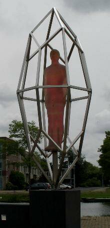 John Lennonplein bij het gemeentehuis: Bas Lugthart (1955) en Maree Blok (1959), 1998, roestvrij staal, giethars en licht, ca. 4.5 meter. Al aan het materiaal kun je zien dat dit beeld nog niet zo oud is: halfdoorzichtig polyester, hetzelfde spul waarvan je boten, surfplanken en allerlei andere artikelen kunt maken. Ziet er niet zo 'duur' uit als brons of marmer. Twee mensen, kaal als etalagepoppen, hun armen strak tegen hun lijf, staan elk in een diamantvormige kooi tegenover elkaar aan het water. Ze kijken naar elkaar. De ontmoeting. Maar ze staan roerloos. Alsof ze bevroren zijn. Alsof de kunstenaars willen uitdrukken dat elk mens in zijn eigen wereldje zit opgesloten en niet in staat zijn om elkaar te ontmoeten. Zou dat door dit beeld beter worden, denk je? Je moet trouwens ook 's avonds een keertje gaan kijken. Dan gloeien de beelden of ze energie uitstralen.